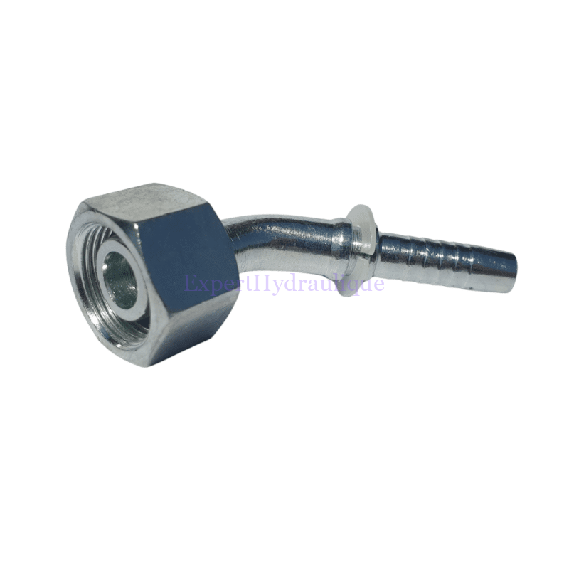 Caractéristiques d’un embout à sertir femelle coudé 45° pour flexible hydraulique :