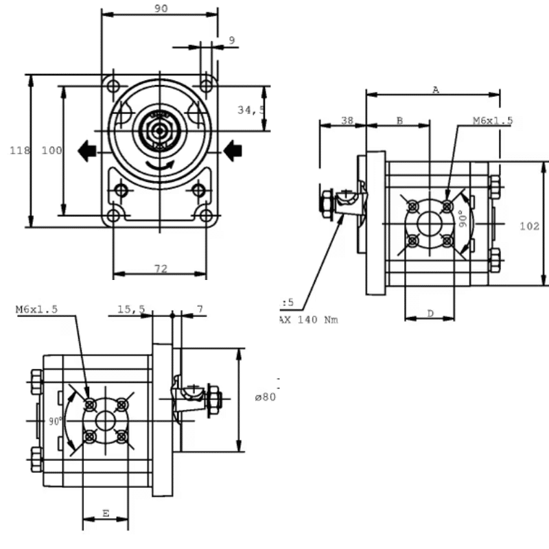 Pompe hydraulique avec flasque standard Allemand type Bosch Casappa. Fixations 72 x 100 centrage de 80 mm et arbre conique 1/5. brides 40×40 et 35x35mm.