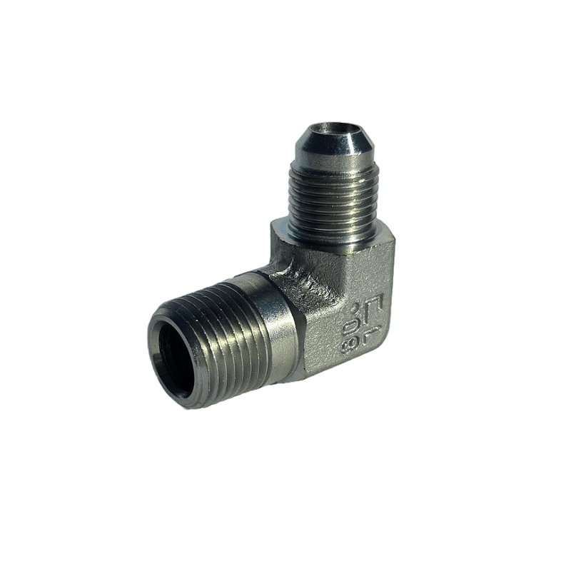 Un raccord coudé adaptateur 90° mâle 9/16″ JIC (UNF) – mâle 3/8″ NPT utiles pour une adaptation JIC (UNF) et NPT.